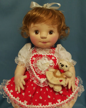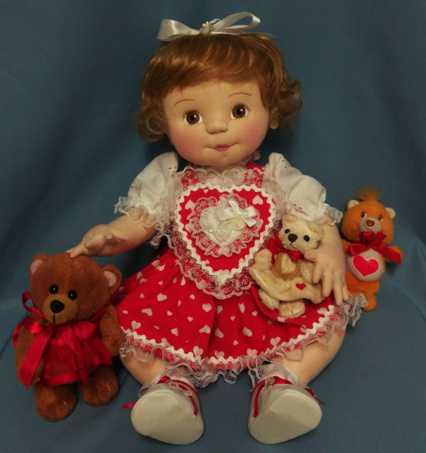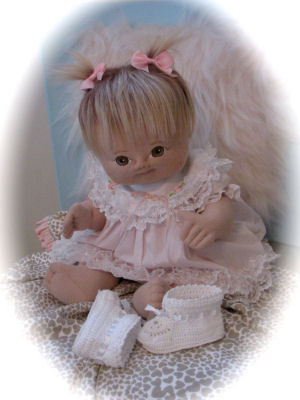 Her body is made of Windsor Comfort fabric and her arms and legs are movable. Since she is 9 months old she can sit on her own. Her face is soft sculptured with dimples and she has Brown Acrylic inset eyes with black eye lashes. Her lips are painted with pink acrylic paint and her cheeks are brushed with red blush. On her little tiny ears she is wearing Pink Crystal Studs.