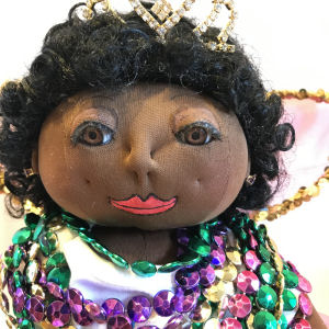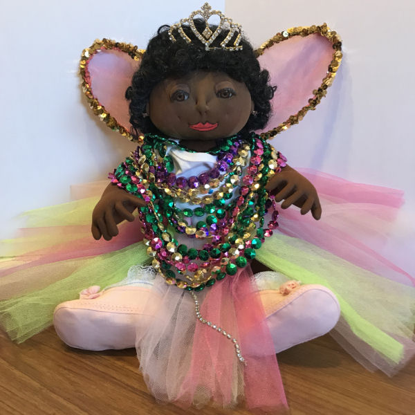 Kisha is a 16" Soft Sculptured Black Baby Doll who is dressed as a Fairy Princess for Mardi Gras.